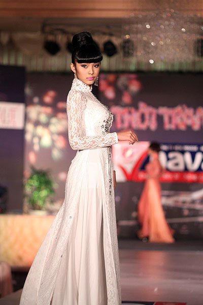 | Bảo Trân đã xuất hiện trong đêm Thời trang A+ với chiếc áo dài nằm trong BST Áo dài đón xuân của Bảo Thạch và Dương Văn Ngời |