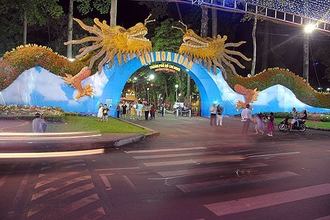 Ấn tượng đầu tiên của Hội hoa mừng Tết Nhâm Thìn sắp tới là cặp lưỡng long hoành tráng được đặt ngay trước cổng vào