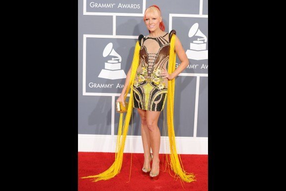 sức xấu xí này của ca sĩ Thụy Điển Robyn. Ngoài cái đuôi váy thừa thãi là đôi giày không ăn nhập gì với trang phục.Robyn xứng đáng giành giải thảm họa thời trang của Grammy năm nay. |