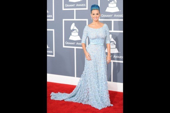 | Katy Perry nổi tiếng với những chiếc váy nhiều màu sắc tại các lễ trao giải. Cô cũng thường xuyên đổi màu cho mái tóc của mình. Tại Grammy năm ngoái Katy Perry đến lễ trao giải với đôi cánh thiên thần còn lần này lại gây chú ý với mái tóc và trang phục màu xanh. |