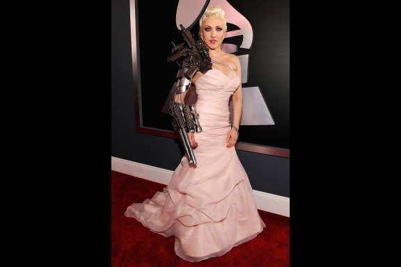 | Sasha Gradiva có lẽ đang muốn tôn vinh kẻ hủy diệt bằng cách lắp vào tay phụ kiện đầy tính bạo lực và không hề ăn nhập với chiếc váy màu hồng cô mặc chút nào. |