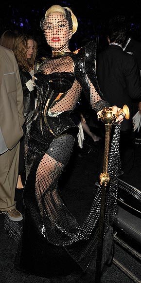 | Lady Gaga như thường lệ vẫn luôn làm người ta choáng váng với kiểu phục trang khác người. Lần này cô chọn cho mình chiếc váy đen đi kèm với một chiếc mặt nạ lưới mà không biết gọi tên là gì. |