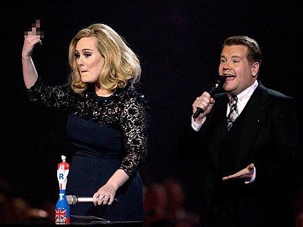 Adele, nữ ca sĩ vừa giành 6 giải Grammy đã giơ ngón tay bẩn để biểu lộ sự phản đối sau khi người dẫn của lễ trao giải thưởng âm nhạc Brits Awards xen vào bài phát biểu nhận giải của cô.
