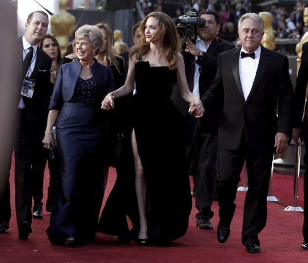 Angie bước trên thảm đỏ cùng bố mẹ Brad Pitt. Ảnh: AP |