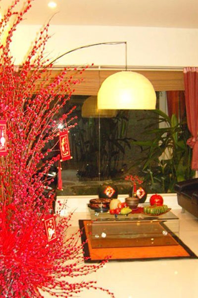 | Nụ tầm xuân đỏ thắm đặt trong phòng khách khiến bất cứ ai đến thăm đều cảm thấy không khí thật ấm cúng (Ảnh: eva) |