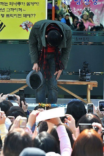 | Bi Rain cúi chào người hâm mộ để lên đường nhập ngũ. |