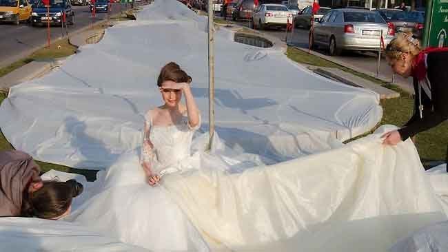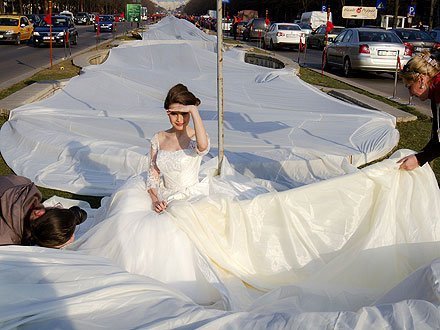 Andree Salon, nhãn hiệu thiết kế của Romania vừa ra mắt chiếc váy cưới lập kỷ lục thế giới mới với đuôi váy dài tới 1,85 dặm (gần 3 km). Kỷ lục cũ thuộc về chiếc đuôi váy dài 2,488km.