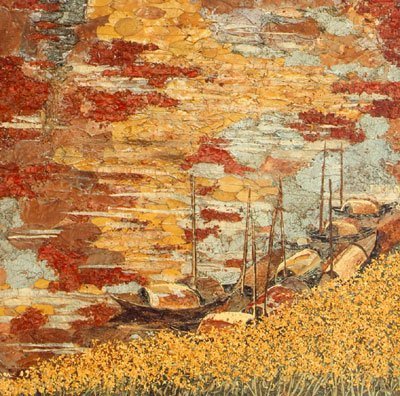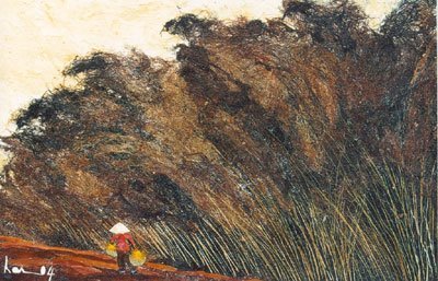 “Một hôm đi công tác nắng quá vào quán nghỉ chân, đang ngồi uống nước nhìn bà bán hàng tãi ngô ra, tớ thấy màu đen, màu nâu của râu ngô hay hay nên xin một nắm về thử dùng làm tranh. Hay có lần đi viết báo ở Vĩnh Linh, có cổng chào lá vàng rất đẹp, hỏi dân lá cây gì, dân bảo cây đung, họ dẫn ra ven bờ biển ngắt lá đung về để khô thành màu vàng rất đẹp", Tạ Hải kể về những sắc màu của lá ông đã tìm thấy.