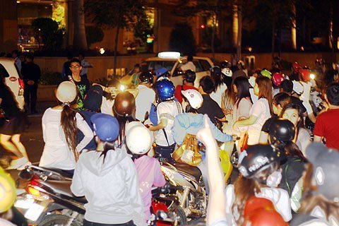Con đường trước cổng khách sạn vốn đã chẳng to, nay lại bị lũ trẻ bị kín khiến cho vài chiếc xe tải nhỏ không may chui vào nhúc nhắc không nổi, phải bấm còi liên tục. Tay phụ xe thò người ra ngoài, đập cửa ầm ầm cũng chẳng thay đổi được điều gì. Cứ ở trên có ai ló đầu ra là đám fan ở dưới lại gào rú điên cuồng. Tất cả đã tạo nên một mớ âm thanh hỗn loại giữa đêm khuya.