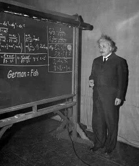 Einstein với đáp án "người Đức nuôi cá" cho bài toán vui nổi tiếng của ông - được tin rằng 98% nhân loại không giải được vào thời điểm đó. Bài toán bắt đầu với giả thiết: "Có 5 ngôi nhà nằm thẳng hàng trên 1 con đường. Mỗi ngôi nhà được sơn một màu khác nhau. Mỗi nhà có 1 người chủ và mỗi người chủ có 1 quốc tịch khác nhau. Mỗi người thích uống 1 loại nước uống khác nhau, hút loại thuốc lá khác nhau, nuôi 1 con thú khác nhau trong nhà... Câu hỏi là: Ai nuôi cá?"