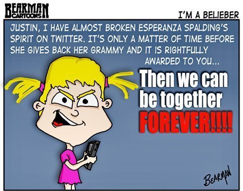 | Lời của một fan dành cho Justin Bieber: “Justin, em đã gần như đẩy được mùi của Esperanza Spalding trên twitter rồi. Vấn đề bây giờ là thời gian khi cô ấy trả lại giải Grammy và anh hoàn toàn xứng đáng được nhận giải thưởng thưởng ấy”. Câu chuyện bắt đầu tại giải Grammy Grammy 2011 khi Esperanza Spalding đã đoạt giải Nghệ sĩ mới xuất sắc nhất mà trước đó ai cũng nghĩ sẽ là Justin Bieber. Đáp lại, fan cuồng của Justin đòi tẩy chay Grammy và thậm chí còn đòi giết luôn Esperanza Spalding. |