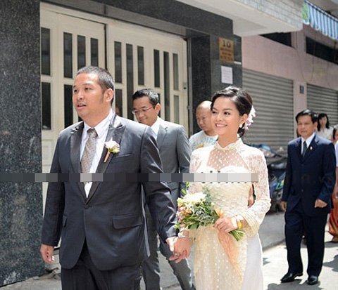 Cô dâu trông rất dịu dàng trong trang phục áo dài ren. Đám cưới còn được chú ý khi chú rể xuất hiện trên chiếc siêu xe Rolls Royce đắt tiền, giá ước tính của nó được một người dự đoán khoảng 25 tỷ đồng.