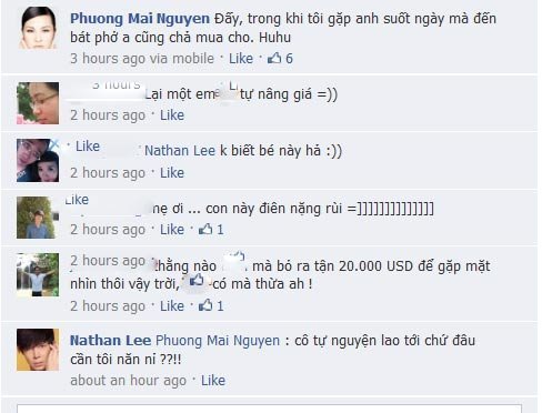 Được "người yêu tin đồn" chia sẻ vể bài báo, người mẫu Phương Mai dù đang bận rộn vói cuộc thi siêu mẫu Việt Nam 2012 cũng hài hước bình luận lại: "Đấy, trong khi tôi gặp anh cả ngày mà đến bát phở anh cũng chẳng mua cho".