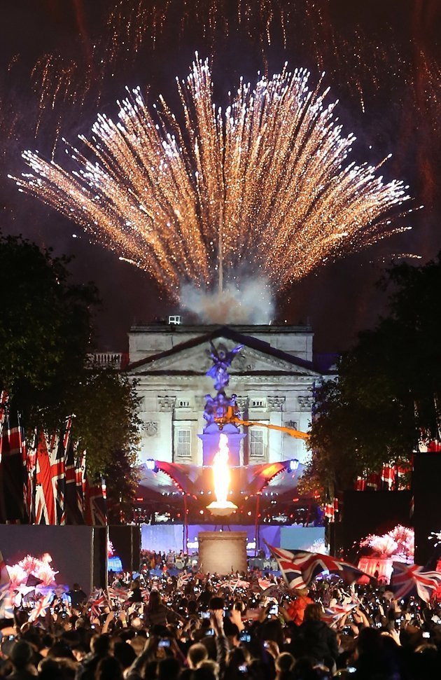 Pháo hoa rợp trời ngoài Cung điện Buckingham, nơi diễn ra buổi hòa nhạc hoành tráng. |