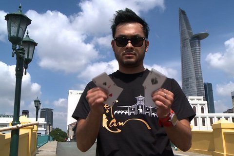 Petey Nguyễn làm ảo thuật trong chợ Bến Thành với một du kháchtrước sự chứng kiến của "hướng dẫn viên" Elly Trần |