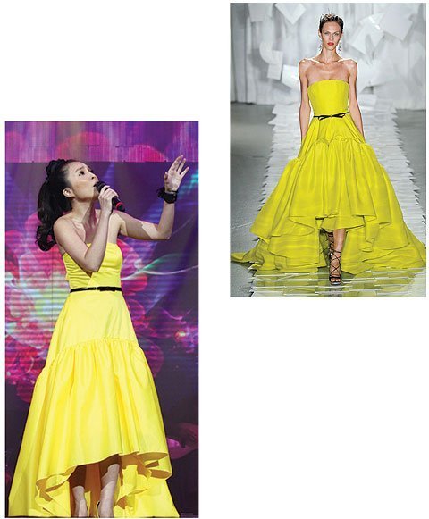 Xuất hiện trong đêm liveshow Tình khúc yêu thương của Lệ Quyên với một bộ đầm màu vàng nổi bật, Hiền Thục đã ngay lập tức gây ấn tượng với các khán giả. Tuy nhiên, không biết do vô tình hãy hữu ý mà chiếc váy của bà mẹ một con lại giống với một mẫu thiết kế nằm trong bộ sưu tập Xuân Hè 2012 của Jason Wu đến 100%. Không chỉ từ màu sắc đến kiểu dáng mà còn ở cả chi tiết chiếc thắt skinny màu đen.