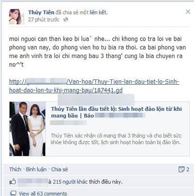 "Mọi người cẩn thận kẻo bị lừa nhé! Chị không có trả lời về bài phỏng vấn này, do phóng viên họ tự bịa ra. Cả bài phỏng vấn mẹ anh Vinh trả lời chị mang bầu 3 tháng cũng là bịa chuyện ra nốt", Thủy Tiên tỏ ra khá bức xúc viết trên trang cá nhân.