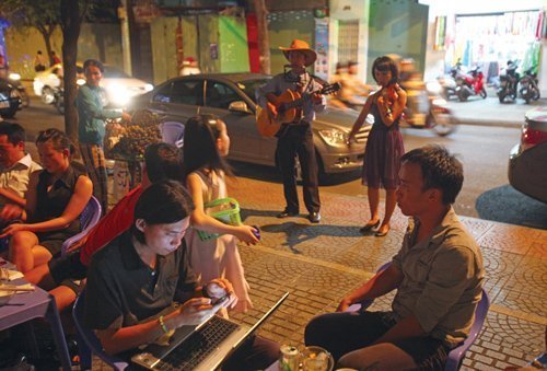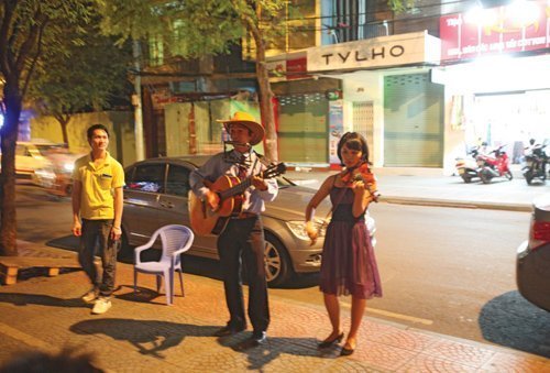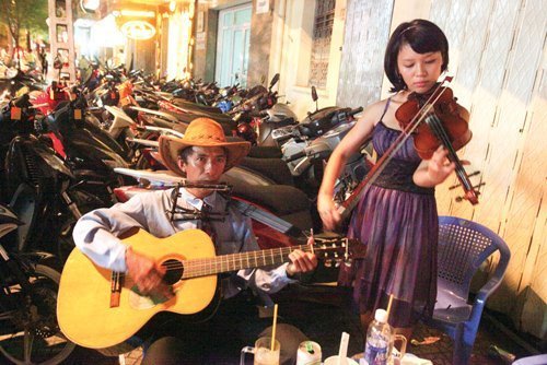 Minh vừa đàn vừa thổi harmonica vừa hát. Còn Quyên chỉ đệm violon.