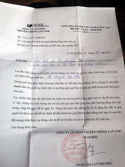 Cũng theo anh Trực thì hai tháng sau cuộc thi, phía BTC là Công ty truyền thông Lan Anh đã gửi cho các thí sinh đoạt giải một văn bản có nội dung gia hạn thời hạn trao thưởng bằng tiền mặt cho thí sinh của Chương trình Đại sứ Thể thao Học đường 2011. Theo đó, vì những khó khăn về tài chính mà BTC đã hứa sẽ trao thưởng cho các em trong vòng 60 ngày kể từ khi có văn bản này.