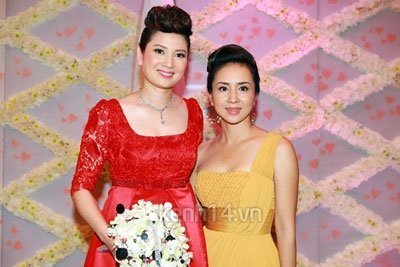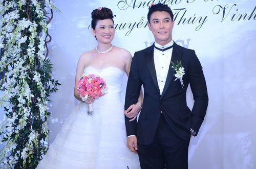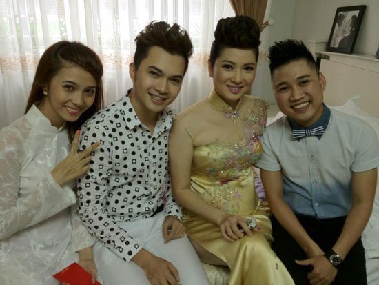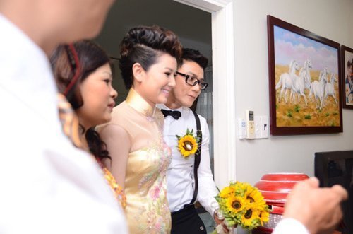 Vốn quen thuộc với hình ảnh tomboy cá tính nhưng trong lễ cưới của mình, Thúy Vinh khiến bạn bè ngạc nhiên khi diện áo dài và trang điểm cầu kỳ, khoe vẻ nữ tính đến bất ngờ. Bà bầu của Nam Cường, Ngô Kiến Huy, Việt My... chọn cho mình tà áo dài màu vàng lấp lánh ánh bạc trang nhã nhưng không tay nên vẫn khoe được sự trẻ trung, cá tính và năng động của mình.