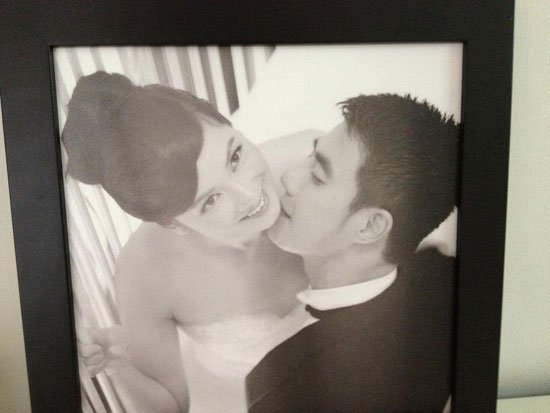 | Bức ảnh cưới lãng mạn của Thúy Vinh và chồng mới cưới được đặt trang trọng trong nhà. |