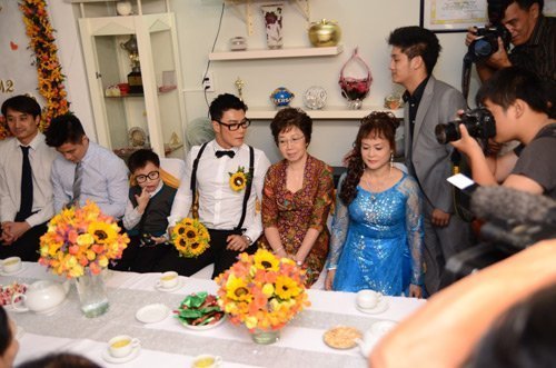 | Cô dâu hồi hộp chờ đợi chú rể tới đón bên cạnh dàn "gà cưng" là Việt My - Nam Cường và Don Nguyễn. |
