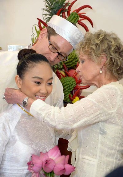 Đoan Trang và chú rể người Thuỷ Điển tươi tắn trong trang phục truyền thống của Việt Nam |