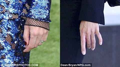 | Chiếc nhẫn cưới Liberty Ross thường đeo trên tay (ảnh trái) còn mấy ngày nay thì không thấy xuất hiện trên tay cô nữa |