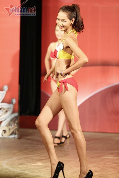 Trong trang phục bikini hai mảnh được thiết kế đẹp mắt với ba gam màu vàng - đỏ - trắng, những đường cong bốc lửa của các người đẹp trở nên gợi cảm và nóng bỏng hơn bao giờ hết.
