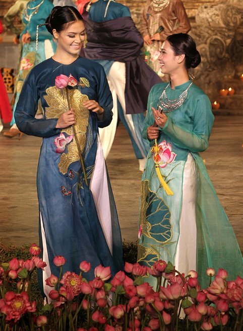 Người đẹp Hương Giang chụp ảnh với sen trắng. |