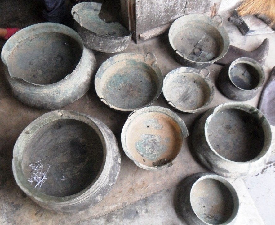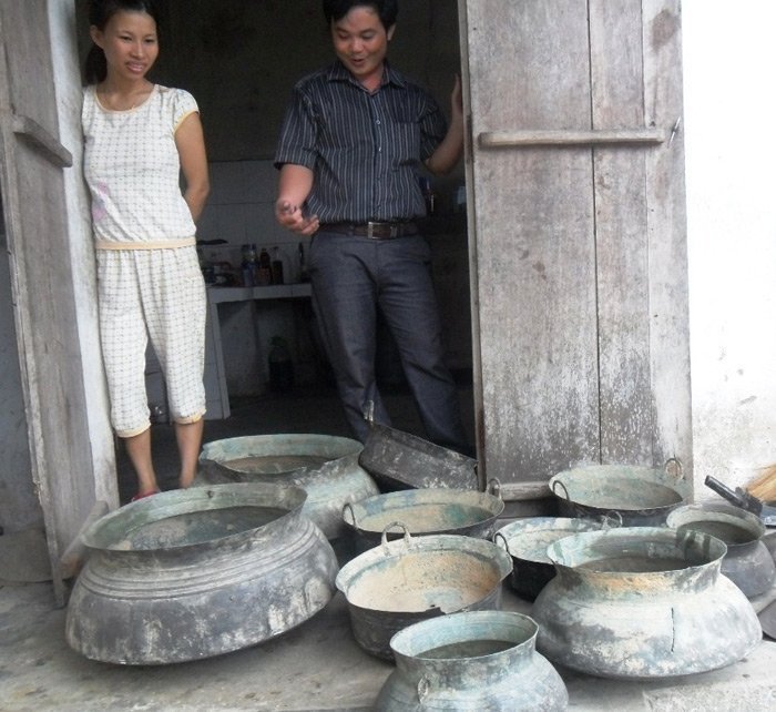Tất cả gồm 10 chiếc nồi bằng đồng có kích thước khác nhau, nhiều chiếc còn nguyên cả hình dáng, và được chôn sâu gần 10 mét dưới lòng đất.
