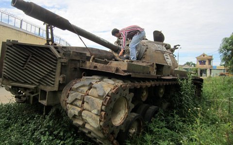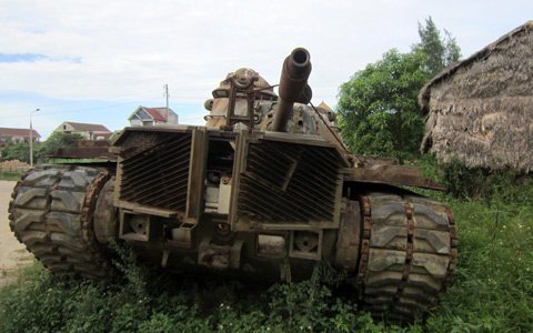 Chiếc xe tăng M48, chiến lợi phẩm trong cuộc kháng chiến chống Mỹ cứu nước được xin về rồi để chỏng chơ bên bụi cỏ ở lề đường.