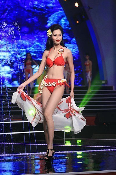 21hh20': Các người đẹp đang trải qua phần thi áo tắm. Có thể dễ dàng nhận thấy cách tạo ấn tượng riêng bằng các phụ kiện đi kèm như vòng cổ, vòng tay hay cài hoa lên tóc của một số thí sinh như Hoài Phương, Đỗ Hoàng Anh...