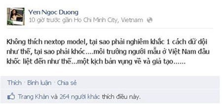 "Tại sao phải nghiêm khắc một cách dữ dội như thế, tại sao phải khóc... môi trường người mẫu ở Việt Nam đâu khốc liệt đến như thế... một kịch bản vụng về và giả tạo...”, người mẫu Dương Yến Ngọc viết trên trang cá nhân về chương trình Vietnam's Next Top Model năm nay.