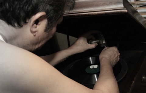 | Nhạc sĩ An Thuyên đang tỉ mẩn thay đầu kim cho chiếc máy hát. |