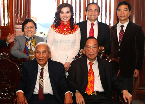 | Vợ chồng hoa hậu Kim Hồng chụp ảnh cùng nhà sử học Dương Trung Quốc (ngoài cùng bên phải) |