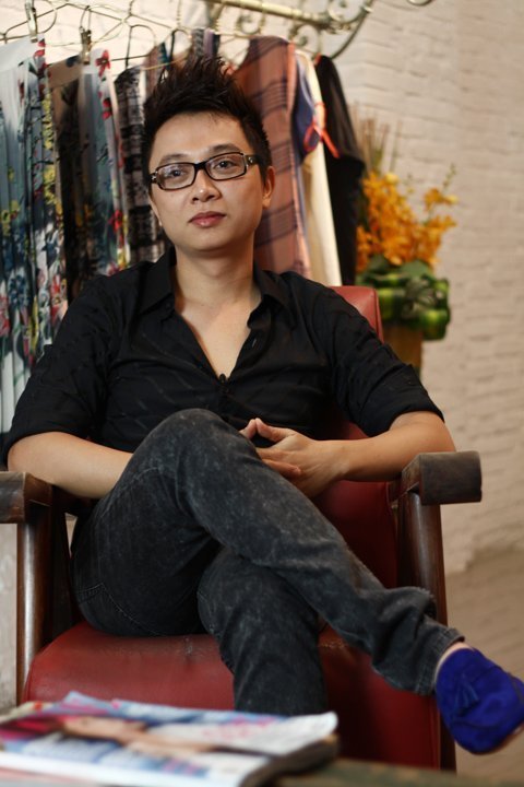 Nhà thiết kế Nguyễn Công Trí ngồi chia sẻ với phóng viên trong phòng khách với bộ bàn ghế gỗ cổ mang phong cách của thập niên 1990.