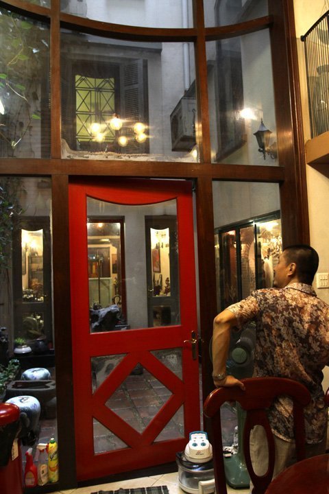 Họa sĩ Đào Hải Phong rất thích chiếc cửa gỗ khổ lớn dẫn từ bếp ra khoảnh sân giữa nhà.