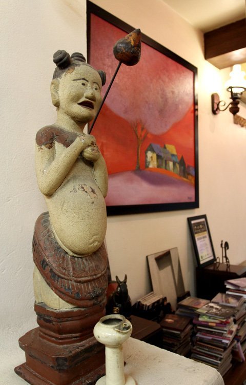 Ngay khi bước qua cánh cổng, vào sân và đi tới phòng khách, người ta dễ dàng cảm nhận tính cách và gu thẩm mỹ của chủ nhân. Không cần nhìn vào những bức tranh treo trên tường hay bước vào khu vực để giá vé thì mới biết đây là nhà của họa sĩ Đào Hải Phong, bởi tất cả đều toát lên từ mỗi món đồ anh bày biện trong nhà, từ những món đồ gốm đến những bức tượng.