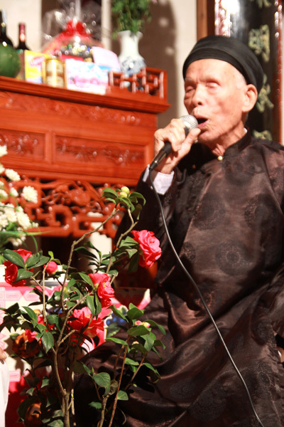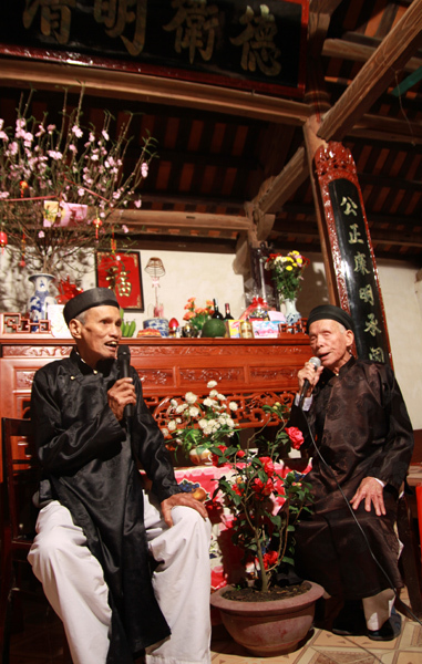Kế và cụ Đạt trong canh hát tại gia. |