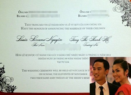 Theo như thông tin in trên thiệp cưới, đám cưới của ngọc nữ màn ảnh Việt sẽ diễn ra vào chiều 11/11/2012 tại TP.HCM.