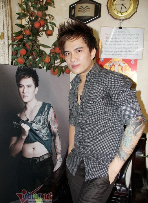 | Lâm Chấn Huy đã xăm hình một chú cá chép ở cánh tay trái trong chuyến lưu diễn ở Mỹ. Trong hình là chàng ca sĩ bên một bức ảnh khổ lớn bày phòng khách. |