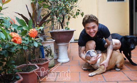 | Vũ Duy Khánh với hai chú chó có tên: Bull Dog, Phú Quốc. |