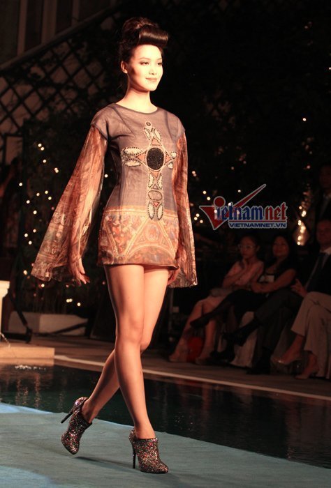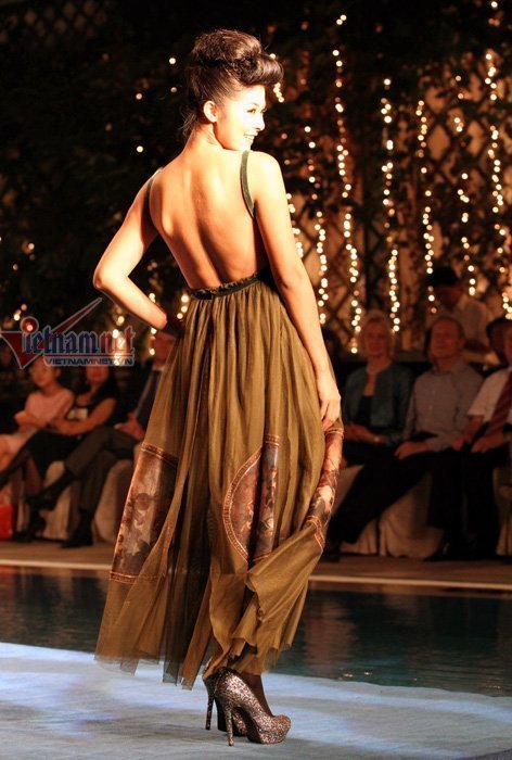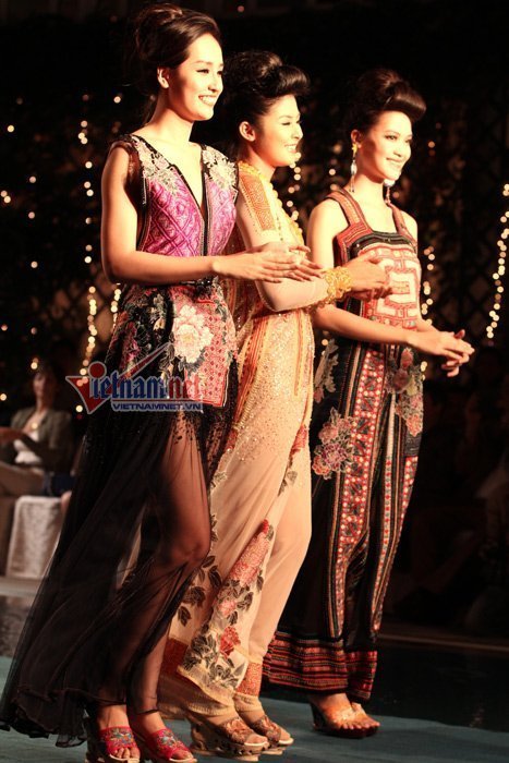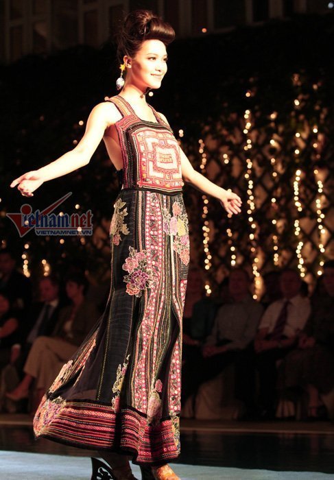 | Mai Phương Thúy với chiếc váy được làm bằng chất liệu thổ cẩm. |
