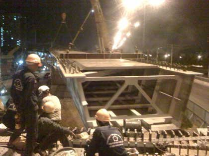 | Hình ảnh chuẩn bị hợp long cầu vượt bằng thép. Chụp lúc 23 giờ ngày 19/12 |