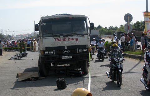 (phanh) bám trên mặt đường, 3 chiếc xe máy đều bị xe tải cán nát. Riêng chiếc xe