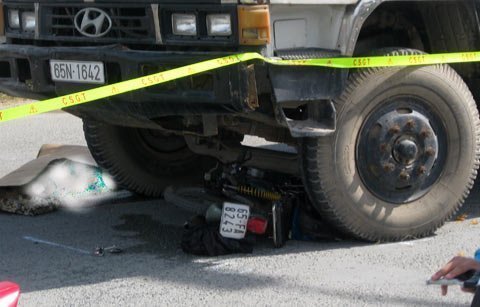 ![]() Xe máy và người nằm gọn dưới gầm xe tải. ![]() |