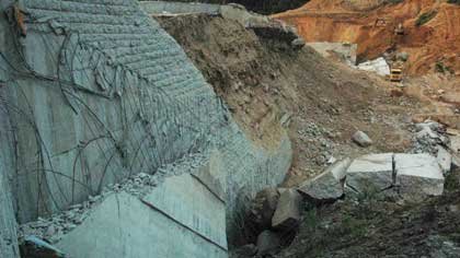 Trong quá trình thi công, do áp lực ngang của đá, cát sỏi cùng với việc xe tải chạy trên mặt đập đã tạo ra áp lực ngang cực lớn, đẩy toàn bộ bờ tường phía thượng lưu đổ sập.
