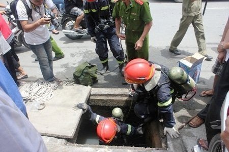 Lực lượng cảnh sát chui vào cống để truy bắt tên cướp tại Quận 9, TP.HCM mới đây (Ảnh: VietNamNet)