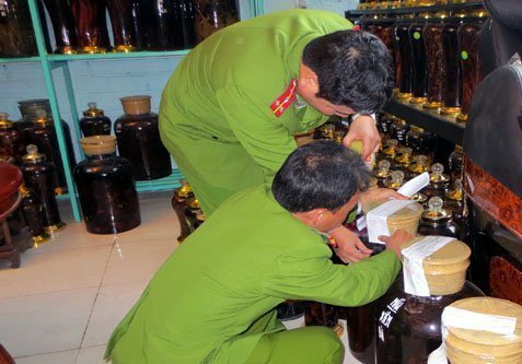 Tại thời điểm đó, lực lượng chức năng phát hiện 1 số lượng lớn các bình rượu ngâm động vật và thảo dược được xếp kín trên tầng 2 cửa hàng.